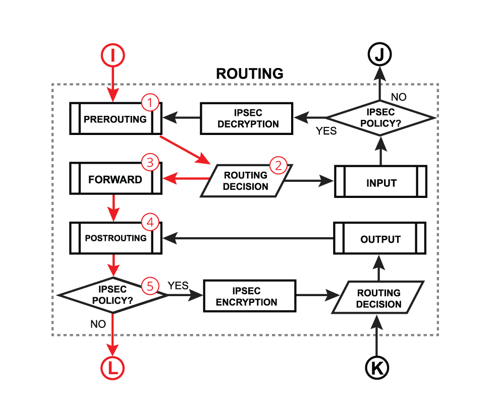 * The rules here apply to any packets that are routed through the current host. This chain is only present in the *mangle* and *filter* tables.