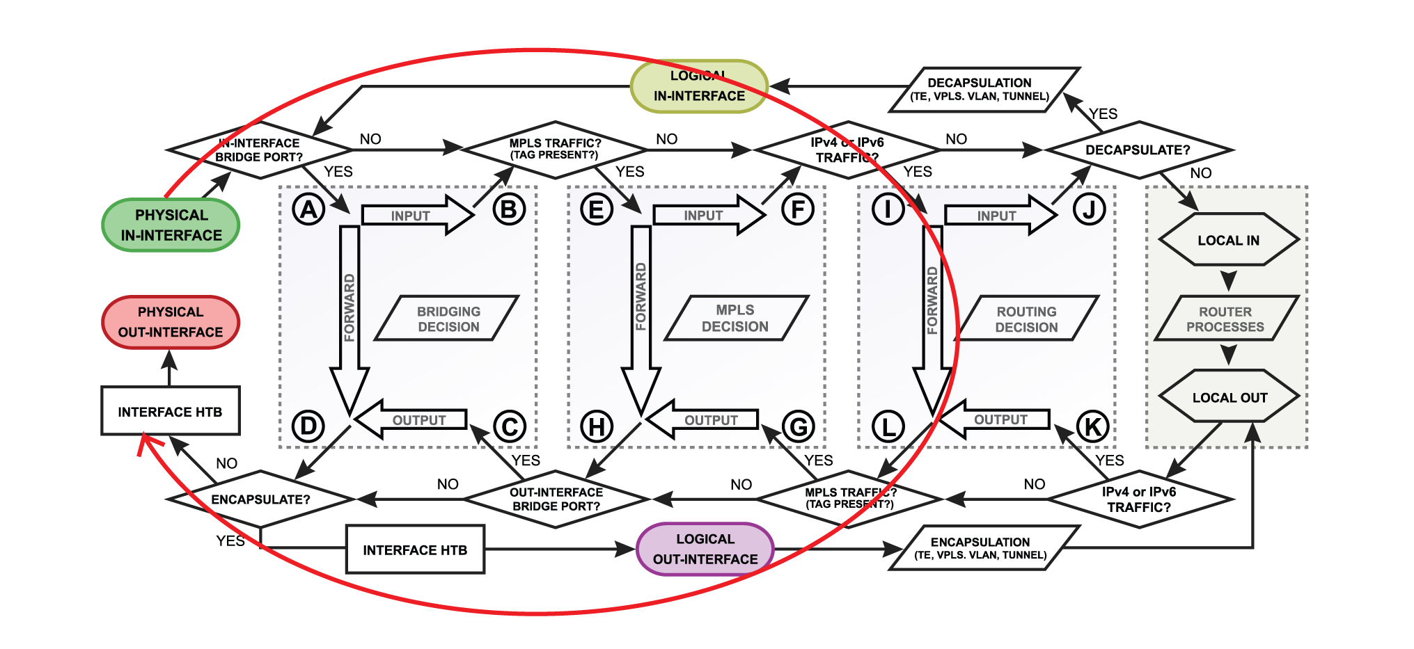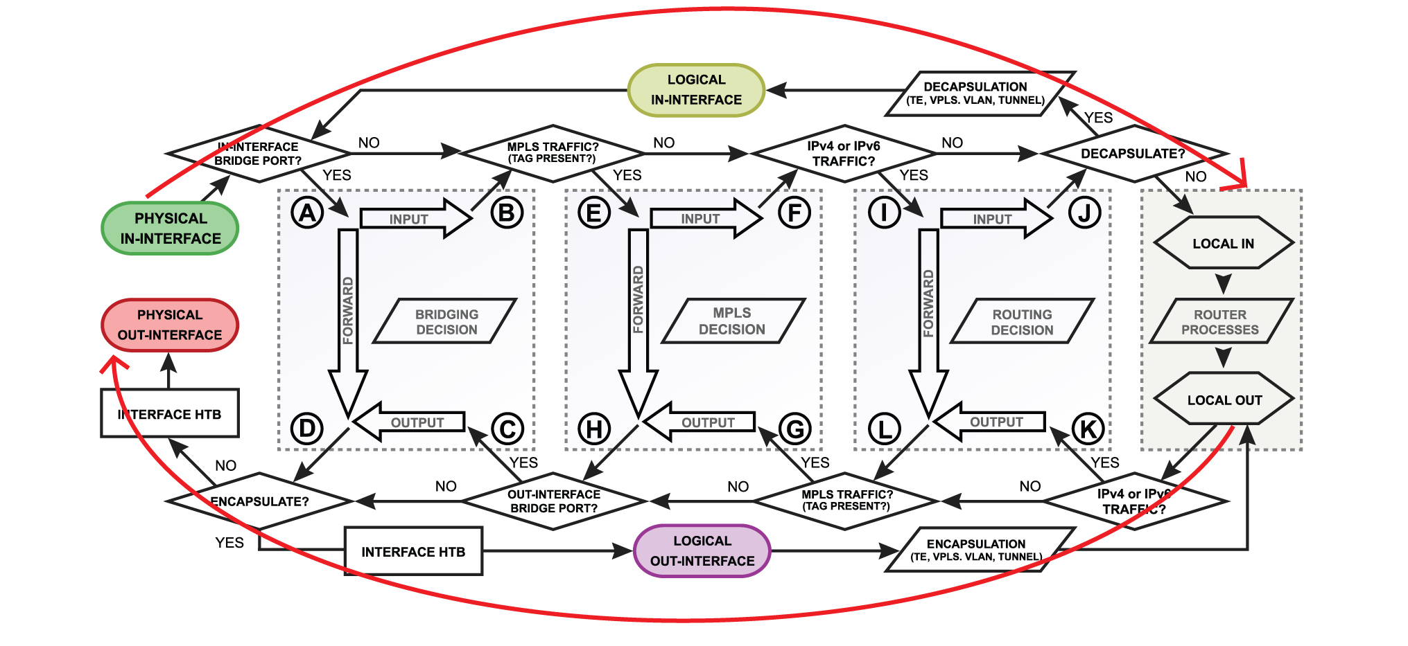 * **logical out-interface** - last point of the packet before encapsulation (to tunnels, IPsec, etc);