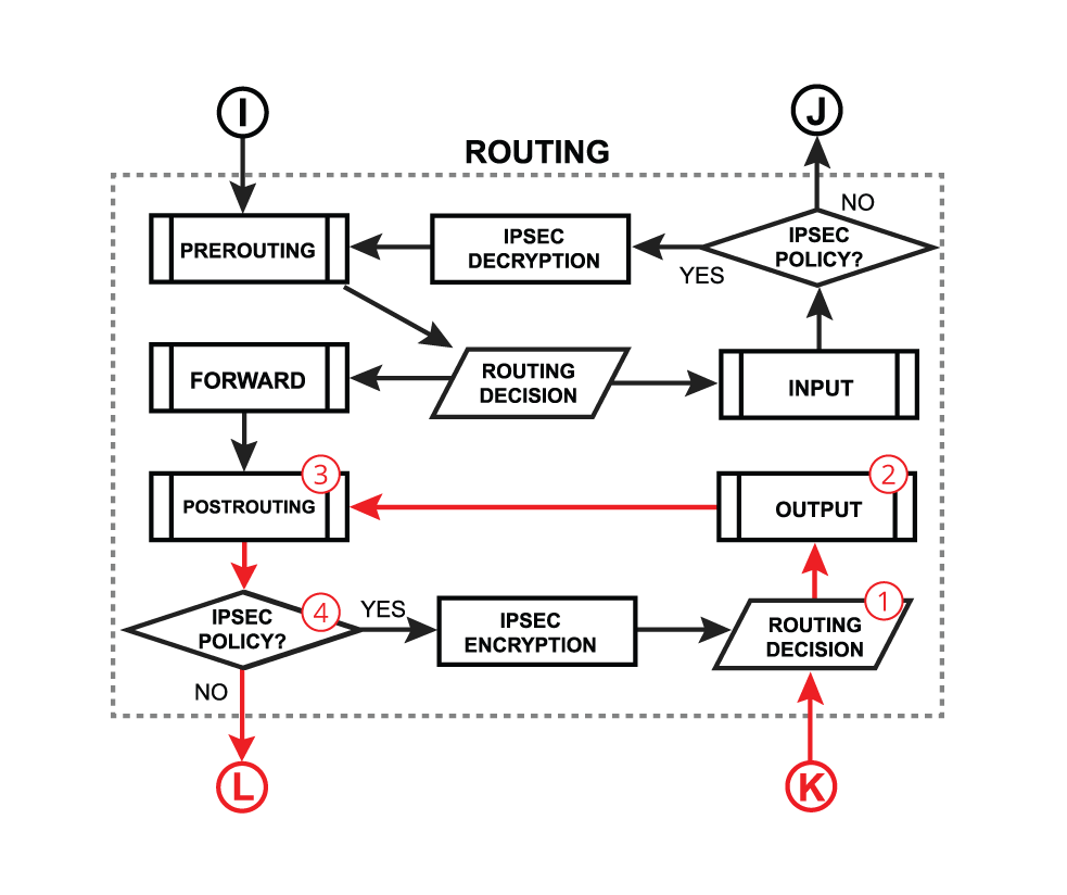 * The rules here apply to packets just after they’ve been produced by a process. This chain is present in the *raw*, *mangle*, nat, and *filter* tables.