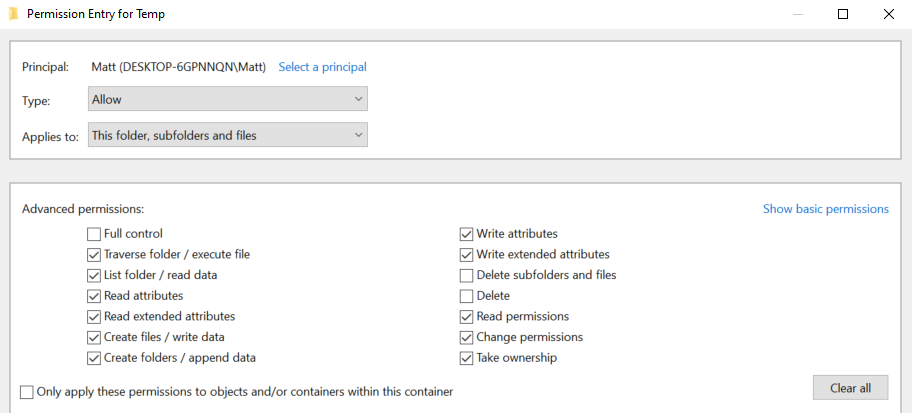* and under `Properties` -> `Security` -> `Advanced` -> `cybervaca` -> `Disable inheritance` -> `Convert inherited permissions into explicit permissions on this object` -> `Edit` -> `Show advanced permissions`,