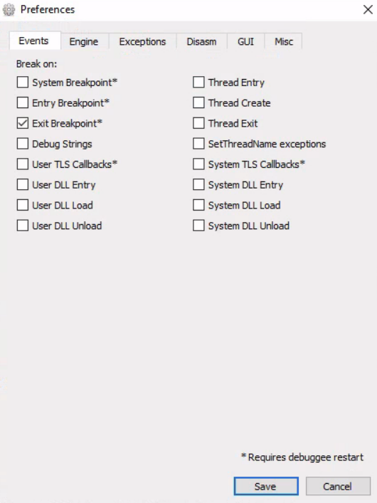 * start `x64dbg`, navigate to `Options` -> `Preferences`, and uncheck everything except `Exit Breakpoint`: