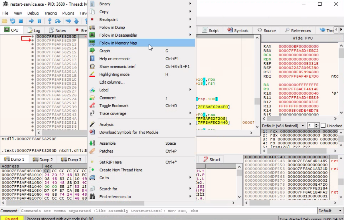 * return to the Memory Map pane, then export the newly discovered mapped item from memory to a dump file by right-clicking on the address and selecting `Dump Memory to File`.
